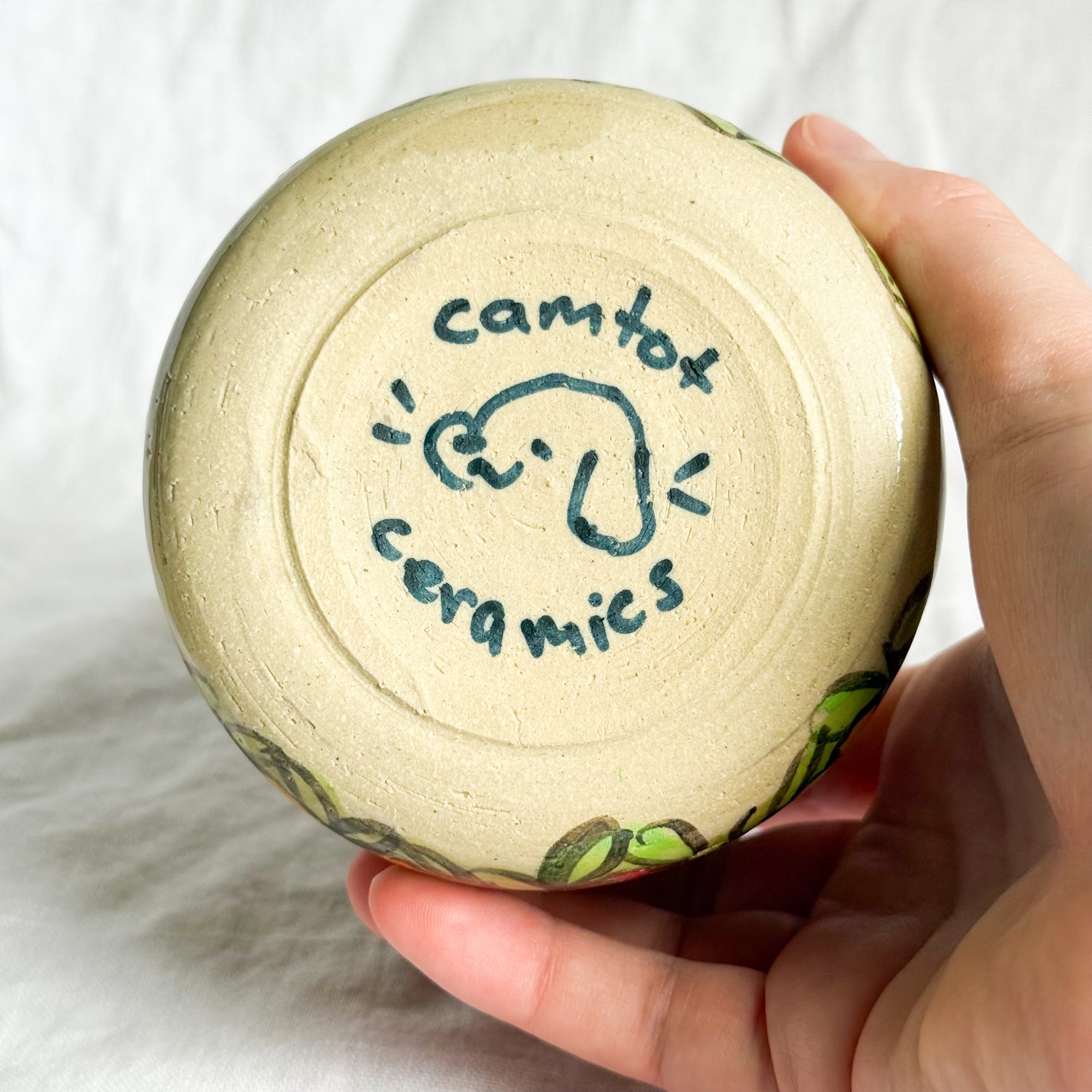 A handmade ceramic cup for holding cold drinks or a desk pencil holder. Suitable for warm drinks too but hot/boiling drinks may make the cup too hot to hold comfortably.