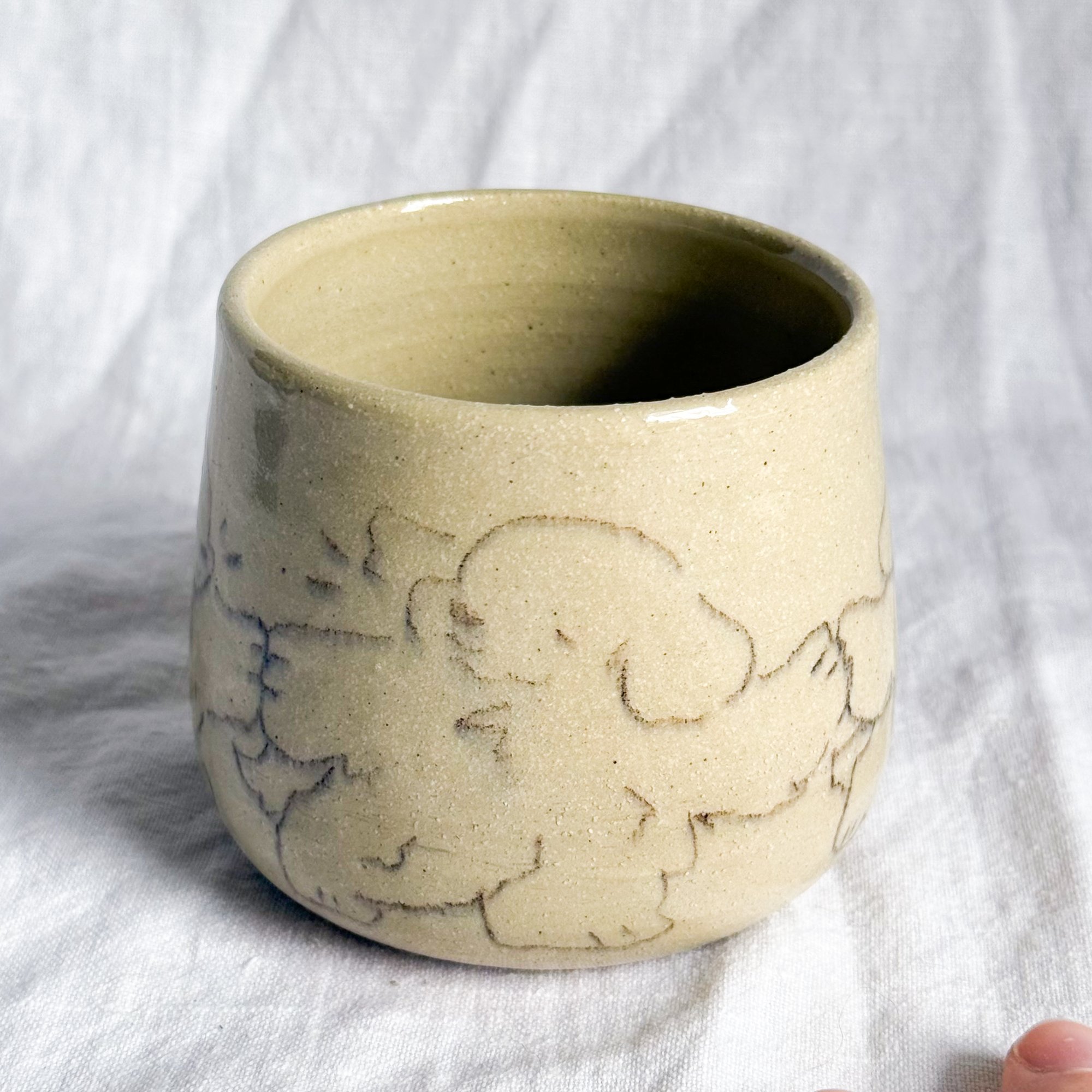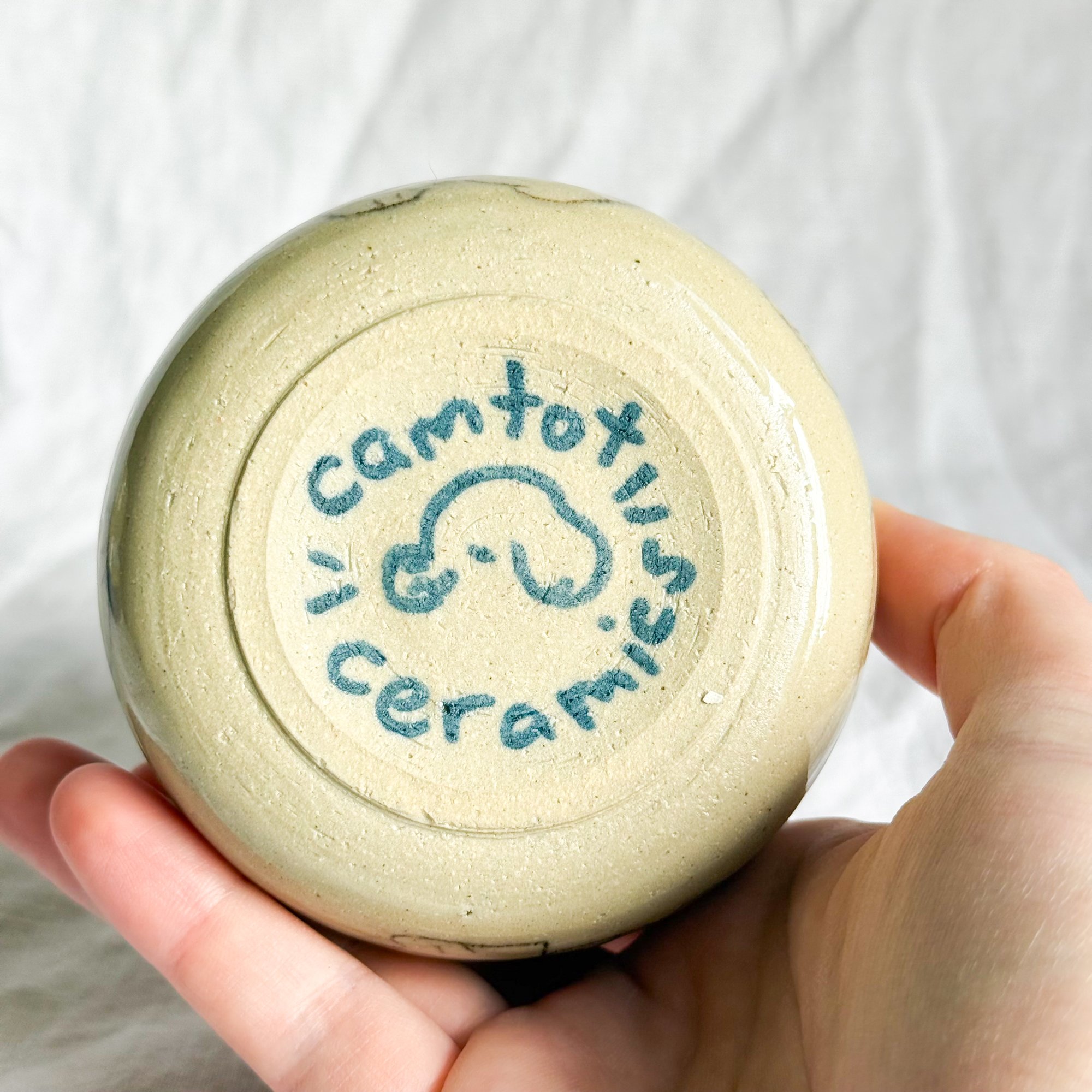 A handmade ceramic cup for holding cold drinks or a desk pencil holder. Suitable for warm drinks too but hot/boiling drinks may make the cup too hot to hold comfortably.