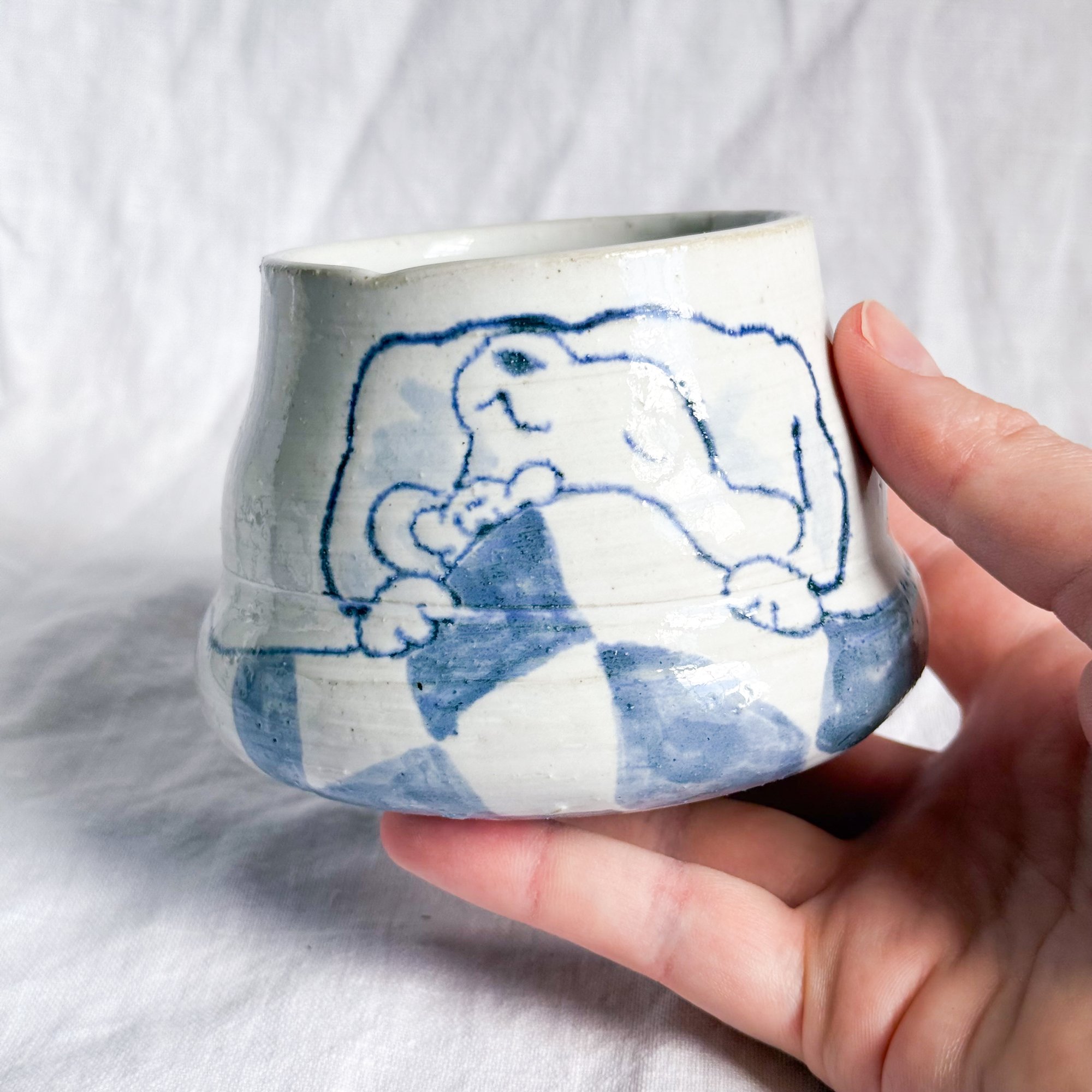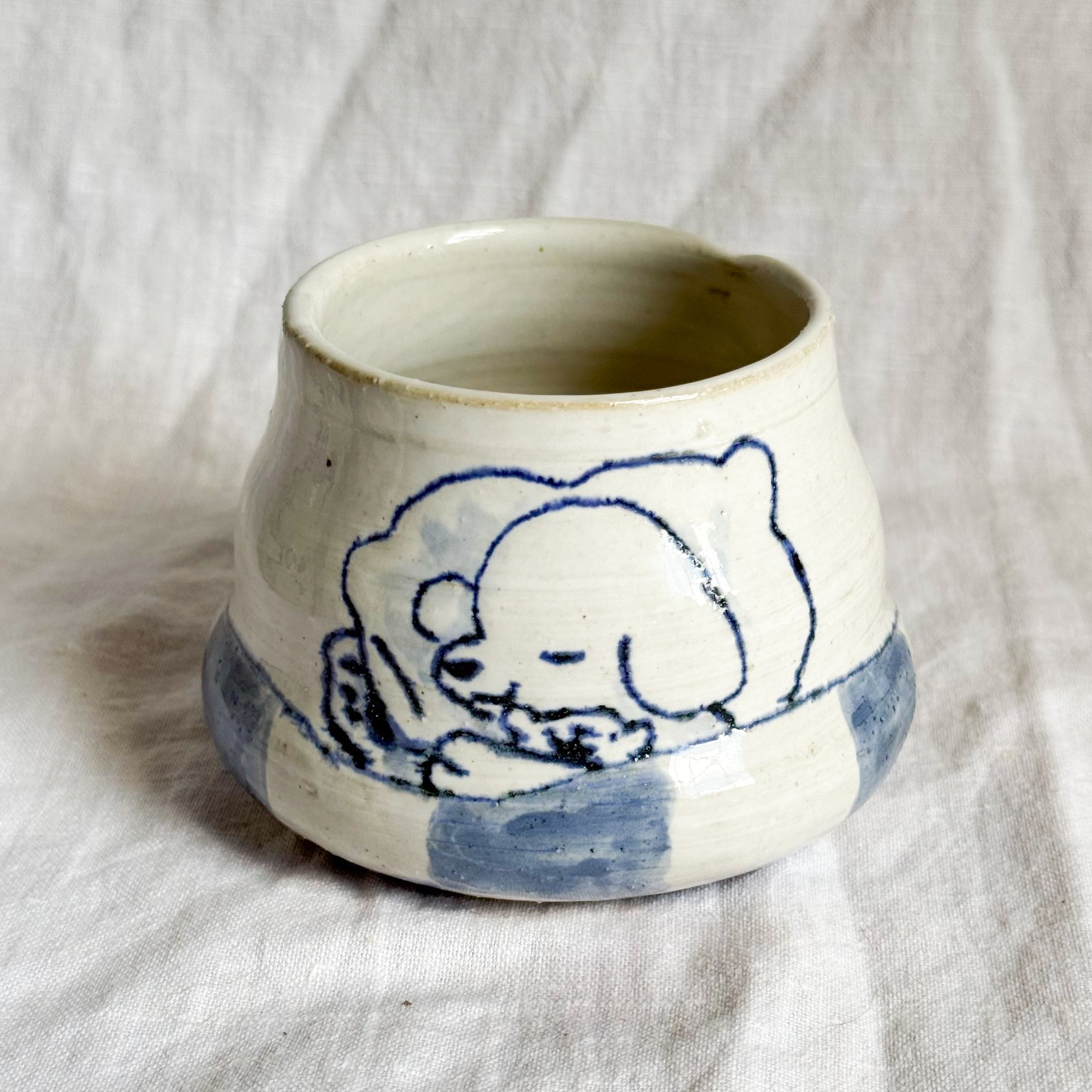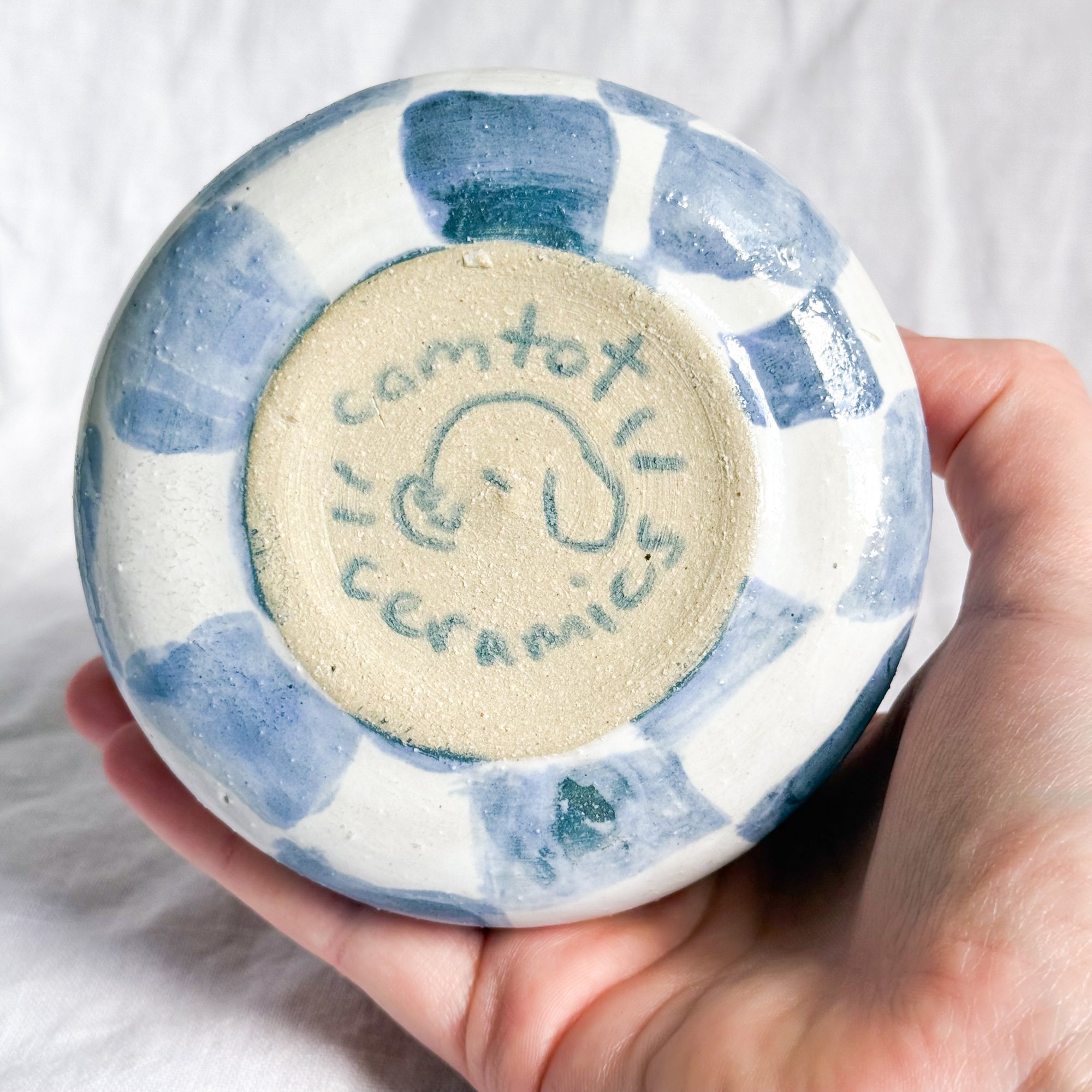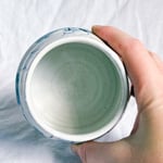 A handmade ceramic cup for holding cold drinks or a desk pencil holder. Suitable for warm drinks too but hot/boiling drinks may make the cup too hot to hold comfortably.