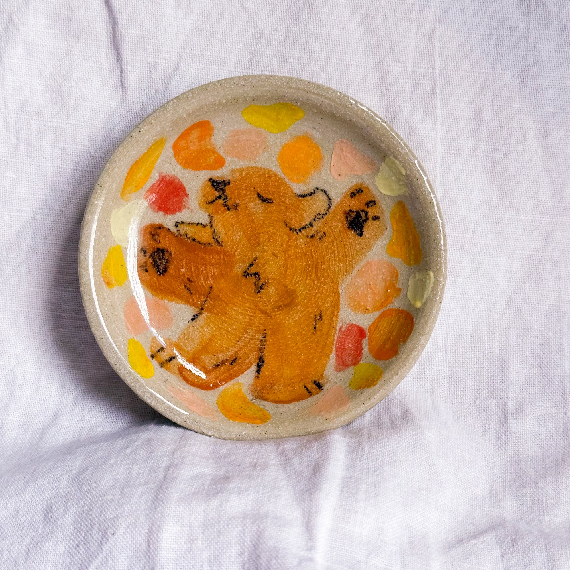 A small, shallow ceramic plate for holding trinkets, snacks, or whatever else you want!