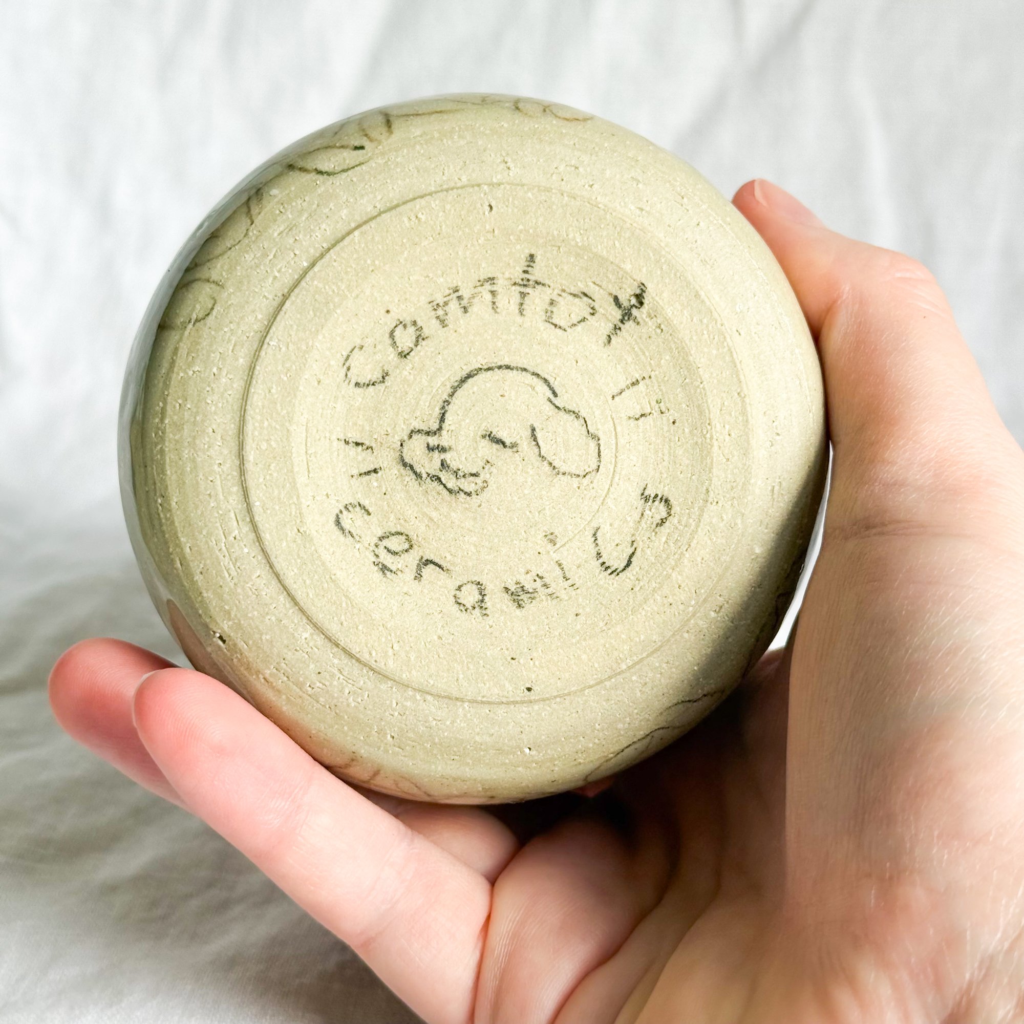 A handmade ceramic cup for holding cold drinks or a desk pencil holder. Suitable for warm drinks too but hot/boiling drinks may make the cup too hot to hold comfortably.